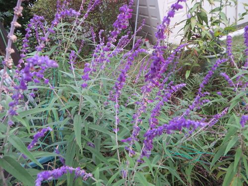 メキシカンセージが次々に咲いています。 花の少なくなった時期に色鮮やかに咲いています。 本来は夏の花なのですが、今年は開花時期が遅く今頃盛りです。 モールのような花で、これを見ていると子供の頃のお祭りの日を思い出します。 色とりどりのモールが…